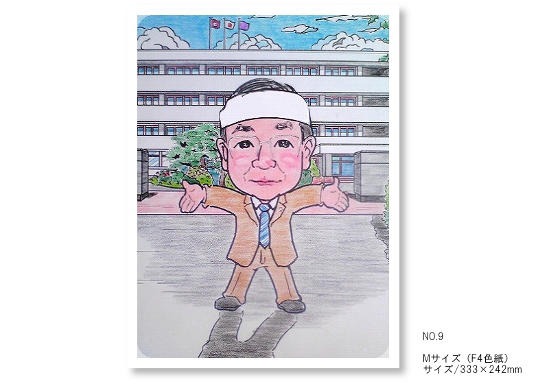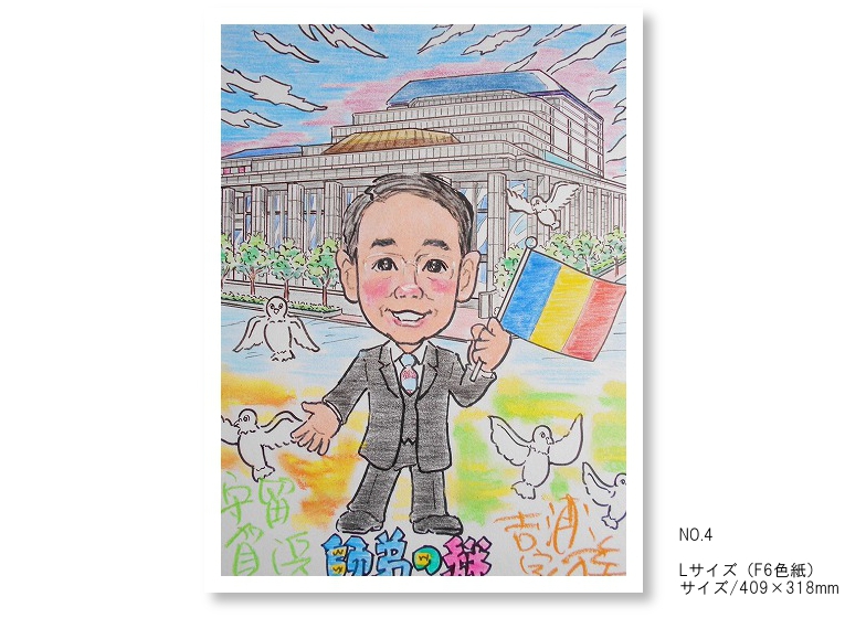 | 制作内容 制作人数 | 似顔絵を描く人数、背景等の要素を加えることで色紙の大きさが変ってきます。 大きさと人数のバランスによる空白部分を小さくするため構成料金(1,000円~3,000円)を 頂くケースがあります。 ●Mサイズ(F4色紙)/色紙サイズ:333×242mm ●Lサイズ(F6色紙)/色紙サイズ:409×318mm ●LLサイズ(F8色紙)/色紙サイズ:458×378㎜ 作成例を参考にしてください。 |