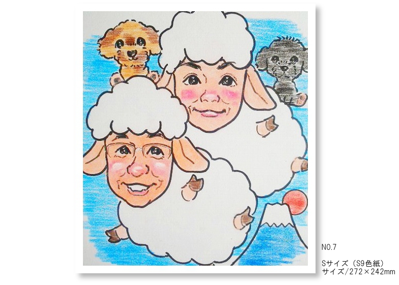 | 通販での 標準価格 | 色紙一枚につき おひとりの場合・・・3,000円 おふたりの場合・・・ 4,500円 3人の場合・・・6,000円 4人の場合・・・7,500円 (※ペットも同様※Sサイズは子供4人までが目安となります。 大人4人の場合ではMサイズとなります。) <価格は税込表示> ※4人以上、また特別なシチュエーション(背景を入れる等は追加料金が必要です)を 希望される場合はお見積りを致します。 人数の基本的な制作料金は2人目以降はについてはひとり当た/1,500円でお描きしています。 ※デザイン文字を入れる場合は追加料金として1,000円プラスとしております。 ※特別なポーズ指定(例)ゴルフのスイングをしている等、 また凝った衣装、制服の指定をされる場合には別途、追加料金が必要になる場合もあります。 似顔絵以外の要素(例)楽器を入れる等、追加料金が必要となります。 ※色紙サイズが変更になる場合には作成料金も変わりますのでご連絡をします。 ●送料:レターパック510(一通につきSサイズなら2枚まで/510円) Sサイズ3枚以上、色紙サイズが大きくなるとヤマト宅配便を利用をします。 その場合は通常、着払い送料でお届けします。(お支払いが銀行振込の場合) 代金引換はJPを利用します。 |