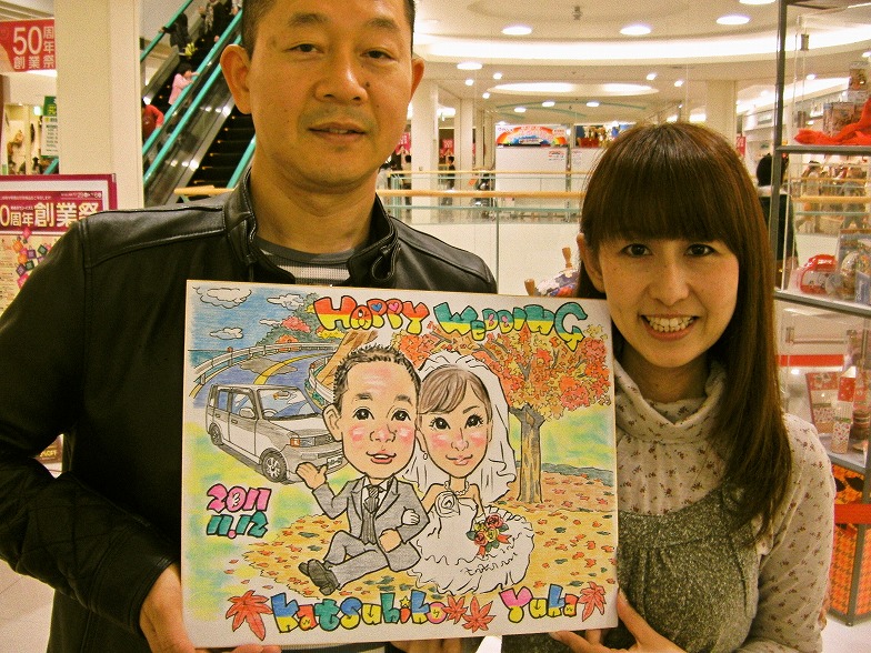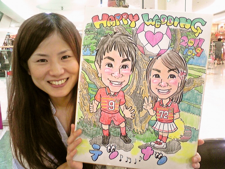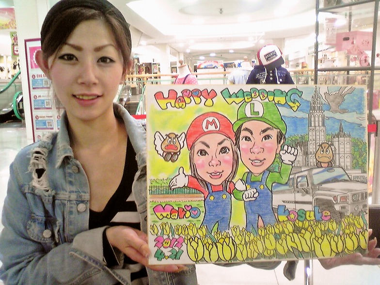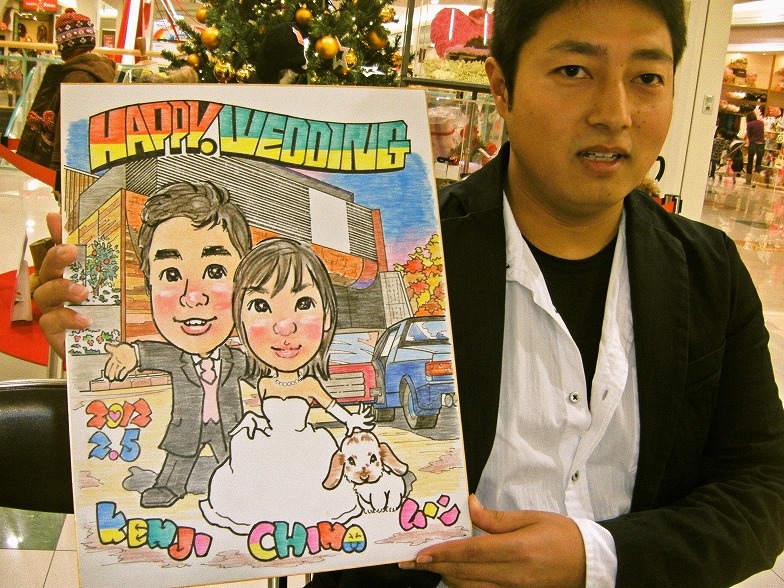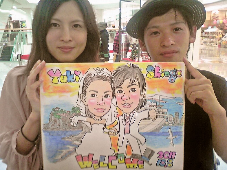 式場のマリエール広島を背景に、一番好きな似顔絵ウエルカムボードです。