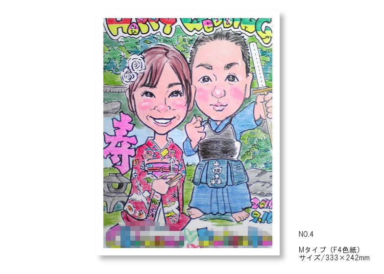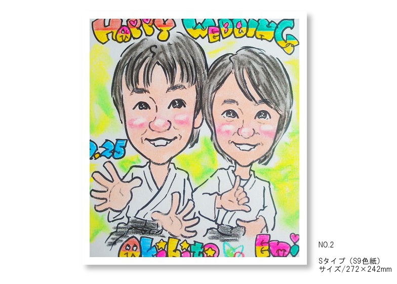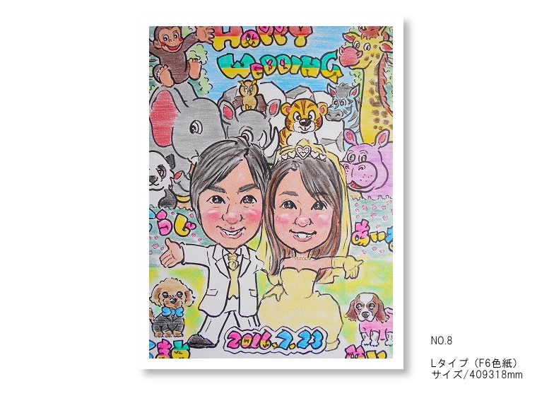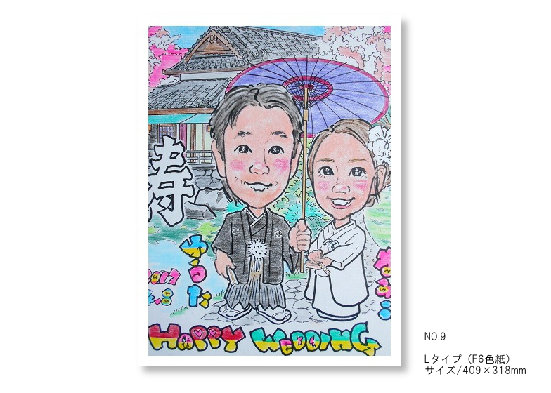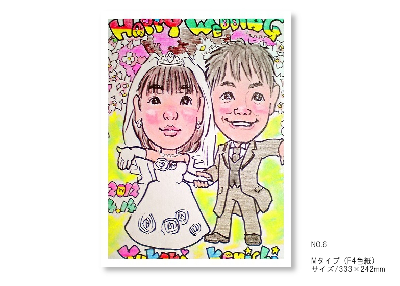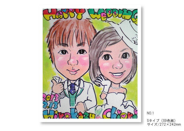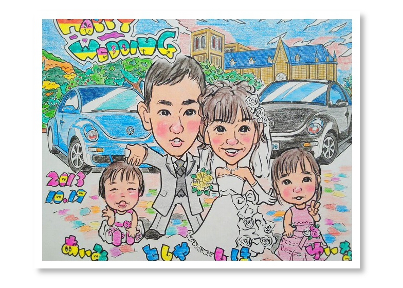 お二人の愛車と背景にはマリアージュ式場をお描きしております。愛車をお入れすることは結構、あります。こちらは当サイトのメインビジュアル(看板)として利用していましたので、個人的に最も気に入っている似顔絵ウエルカムボードになります。 広島県