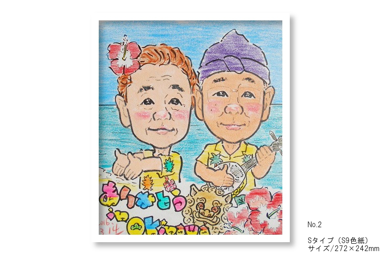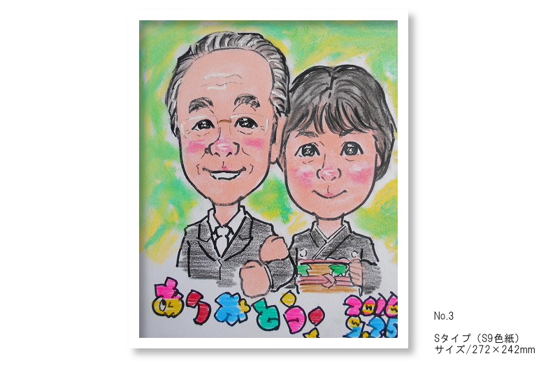 「人生に一度しか無い大切なイベントでのプレゼントを、昭和の似顔絵屋さんにお願いできる事がとてもうれしいです!」ご注文を頂いた時に添えられたメッセージです。私の描く似顔絵との波長が合ったみたいですね。写真資料も多く頂き、丁寧な内容でこのような感じで描いて欲しいと希望もあり、それを良い感じに仕上がるように丁寧にお描きしました。マルッとこんな感じになります。これは遠くから足を運ばれるおじいさんとおばあさんに渡されるものだそうですが、他に下に掲載したご両親の似顔絵の3枚をお描きしております。画像を送った時に頂いたメッセージです。愛知県春日井市